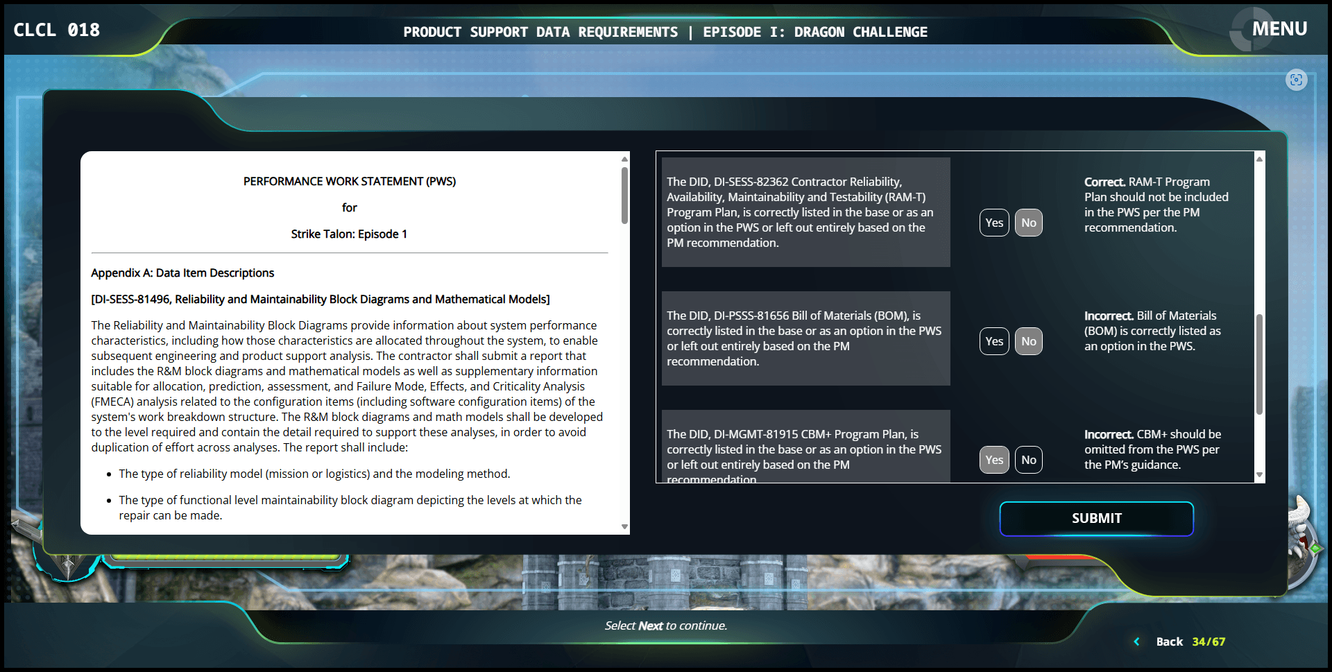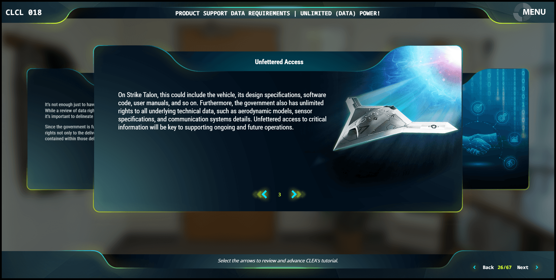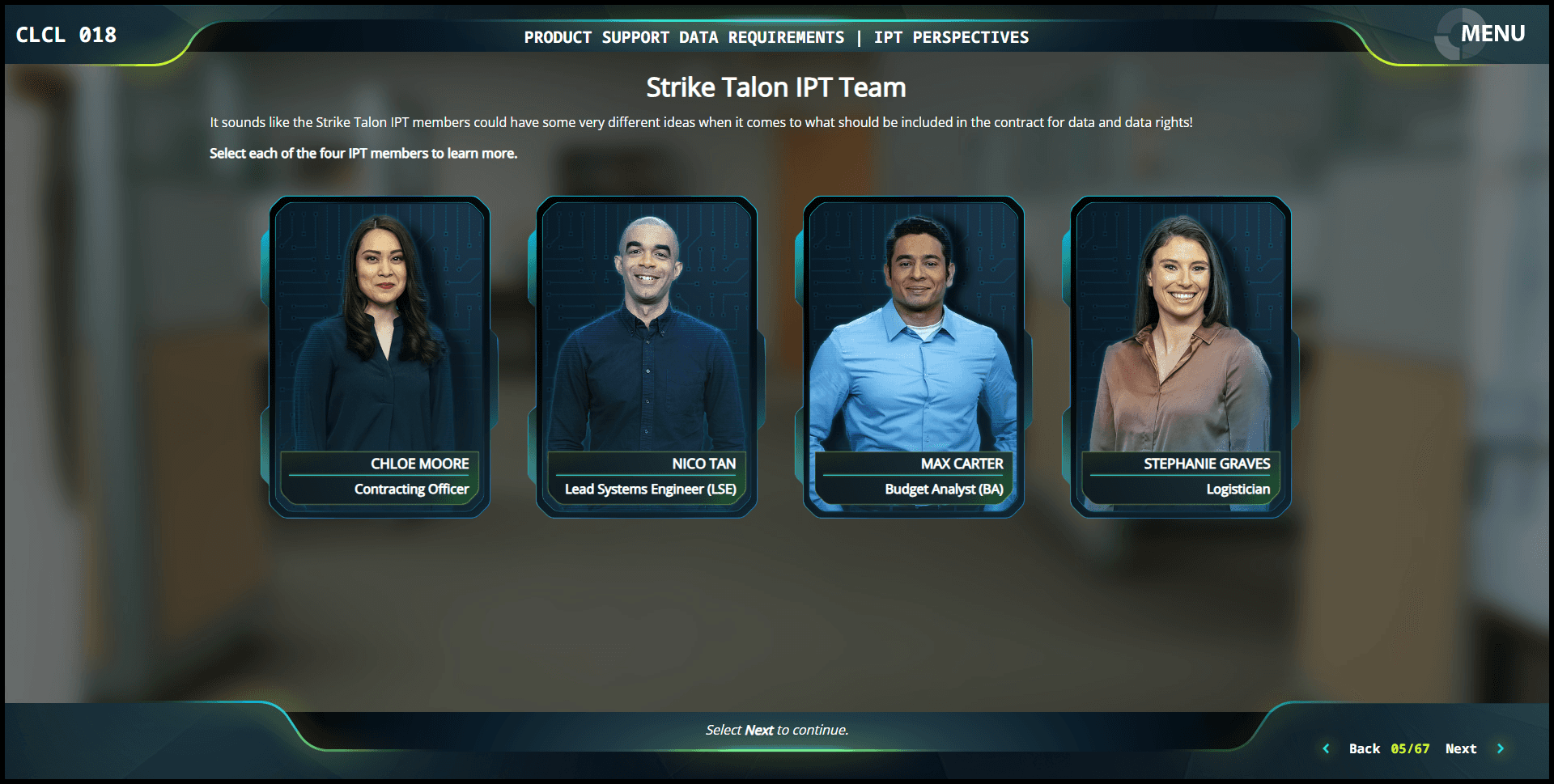 CLCL 018 set out to change that by transforming dense policy and contract guidance into an immersive, scenario-driven experience. The goal was to help learners not only recognize the importance of data and data rights, but to confidently apply them in realistic acquisition situations where decisions carry real consequences for cost, availability, and sustainment.