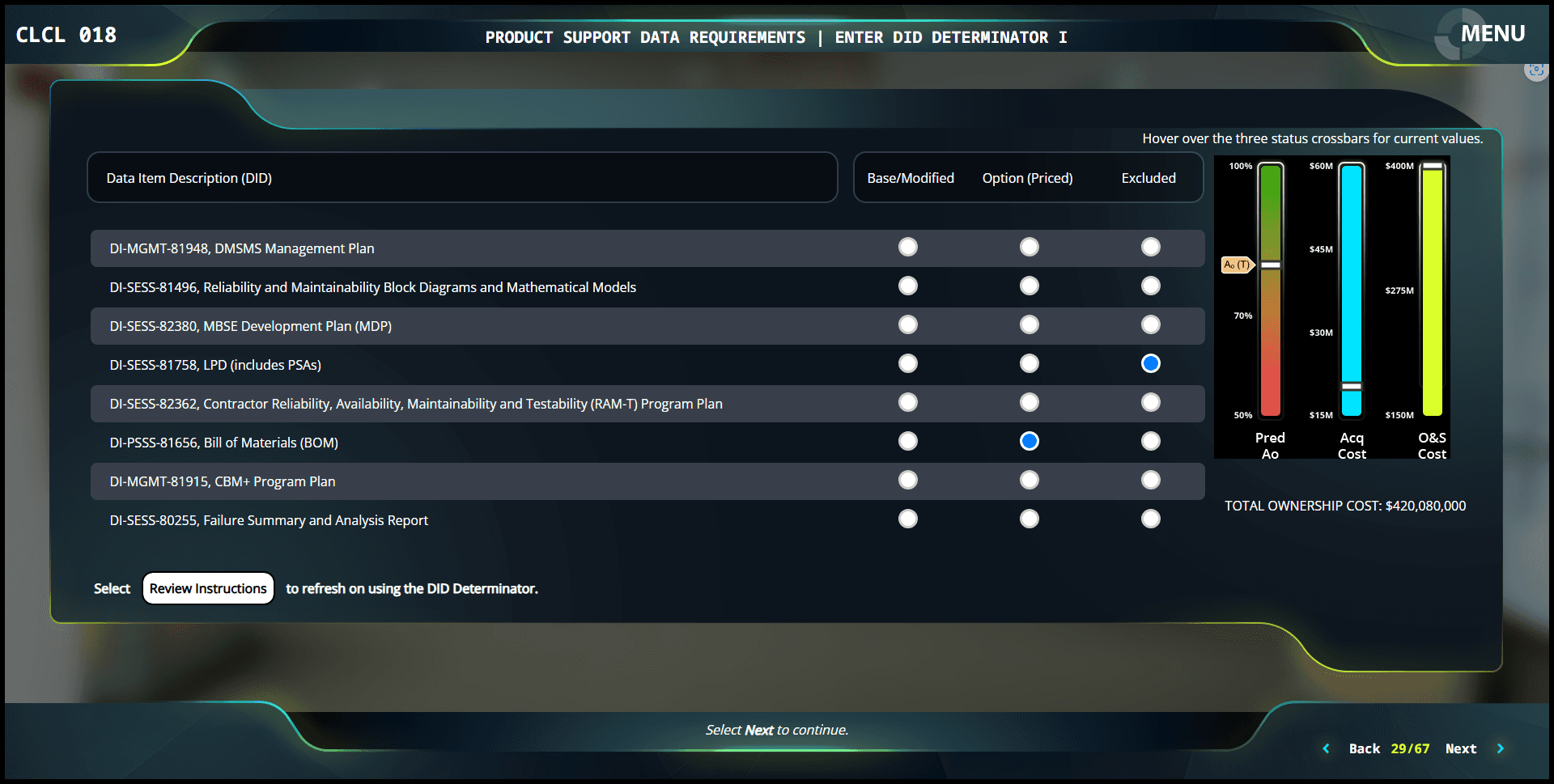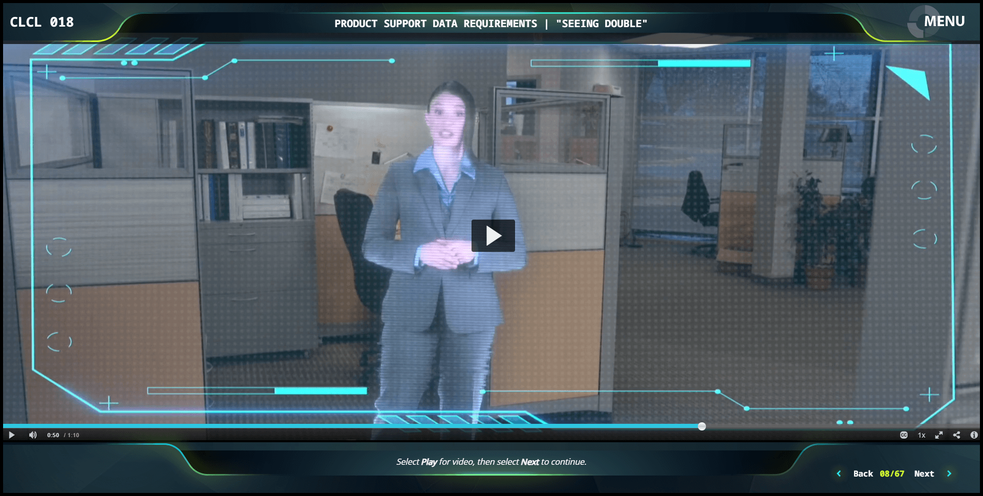The course also incorporated live-action video enhanced with cinematic visual effects, including holographic characters and HUD-style overlays that reinforced key decision points. These sequences blended seamlessly with animated and interactive elements, creating a cohesive experience that felt more like a mission briefing than a traditional course. Scenario branching, feedback loops, and interactive tools such as the DID Determinator reinforced how each choice affected data access, risk, and long-term sustainment outcomes.