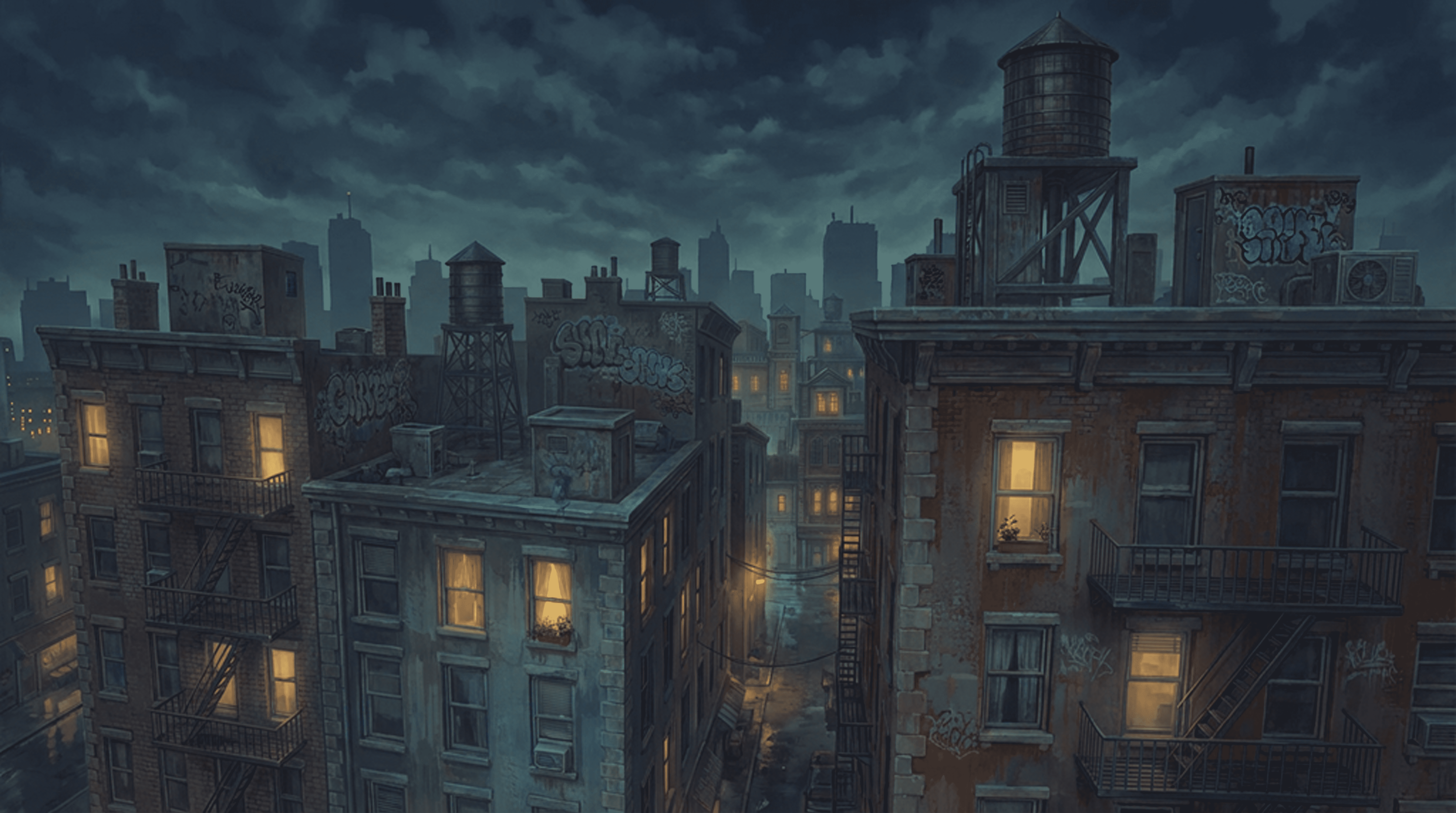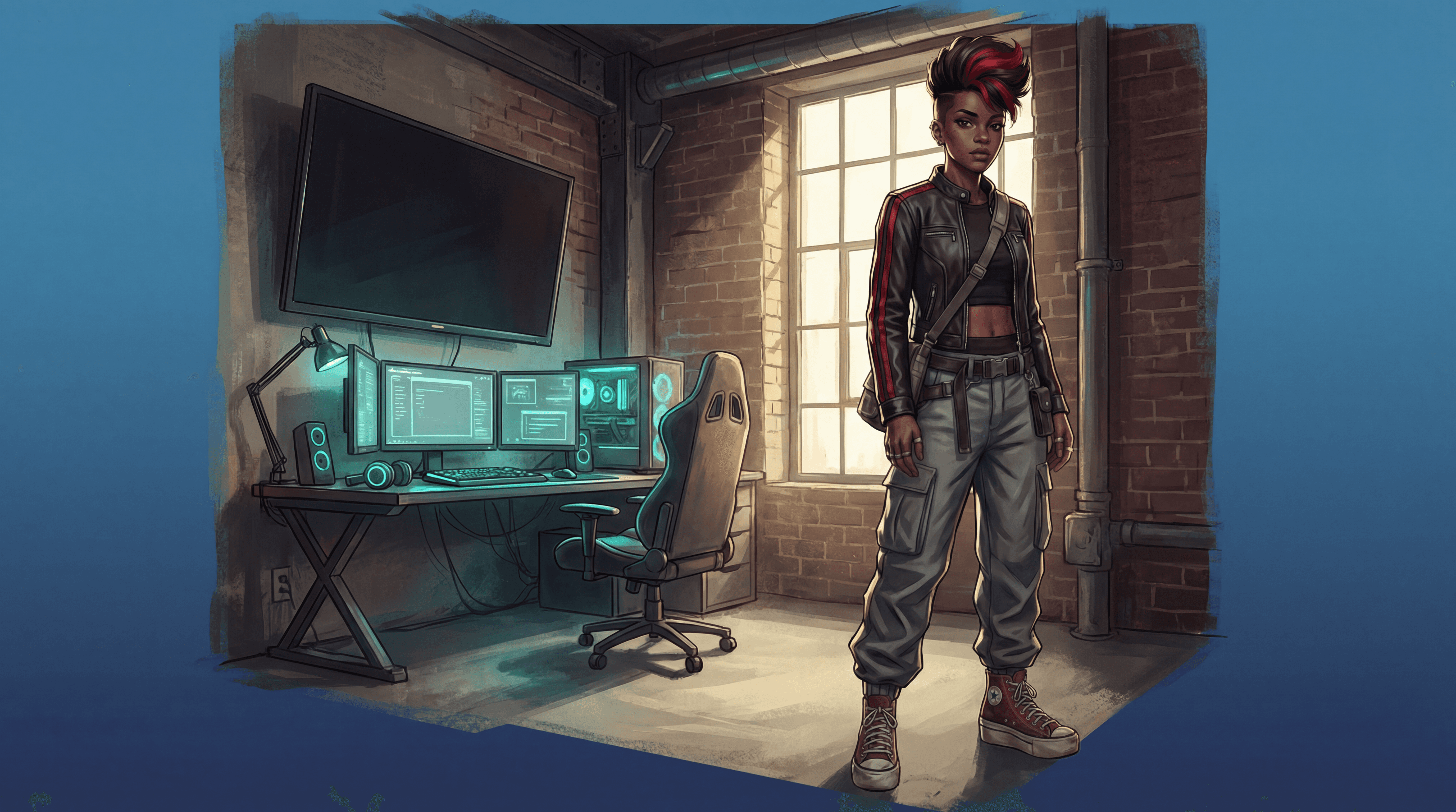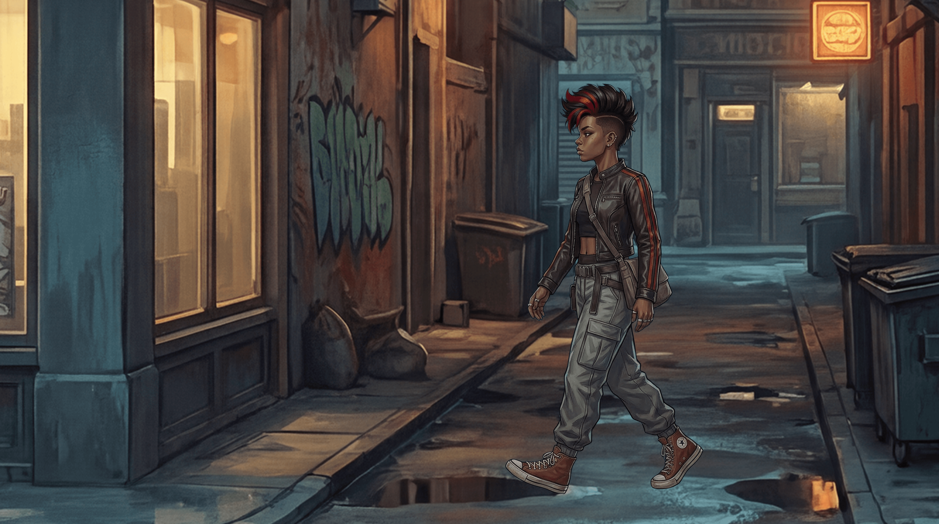 Visually, Mystix leans into a painterly comic book aesthetic inspired by Arcane. Characters are expressive and cinematic, lighting is moody and intentional, and the cyberpunk influence is restrained. Less glowing chrome future fantasy, more worn leather, analog tech, and neon signs that flicker because replacing them costs money and nobody has that right now.